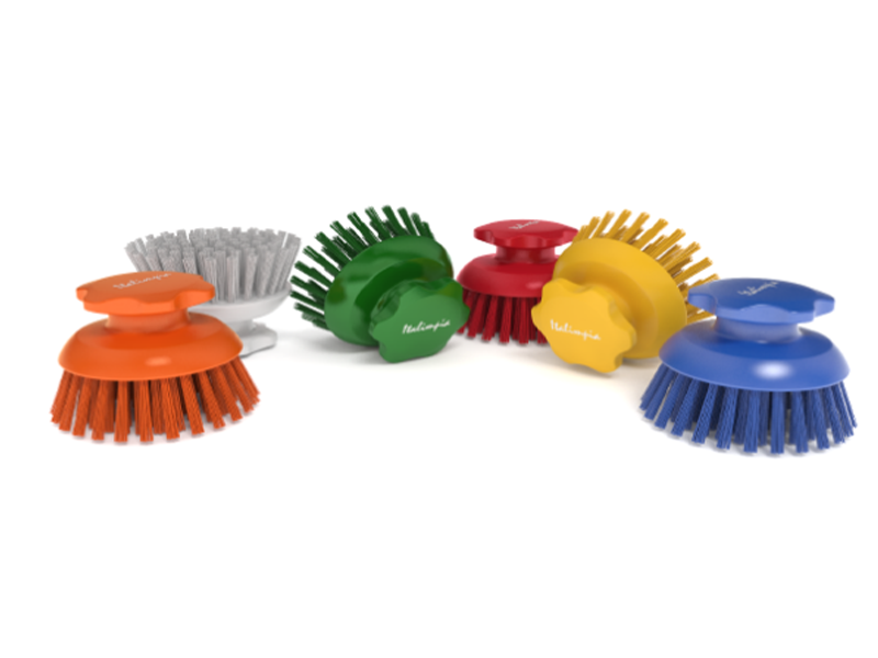 Cepillo redondo de mano con fibras en ángulo ideal para limpieza profunda en mesadas, rincones, paelleras, ollas, pailas, etc.