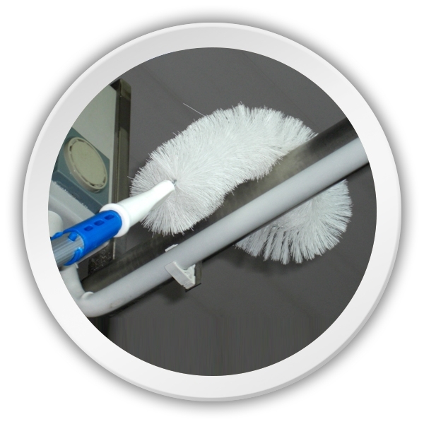 Su forma curva se adapta perfectamente al perfil exterior de tuberías y caños. Rosca adaptable a mangos extensibles de distintas alturas.